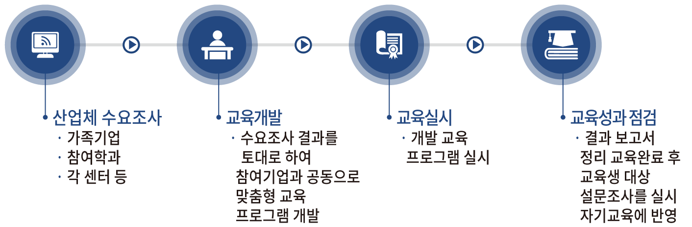 가족회사가 가진 기술적 애로사항, 경영문제 등에 대해 대학의 우수한 교수진과 내ᆞ외부 전문인력을 활용한 맞춤형 교육 지원으로 직원의 업무능력 배양 4차 산업혁명에 대비한 교육 프로그램 운영을 통한 지역경제 활성화 제고 및 평생학습 기회 제공